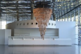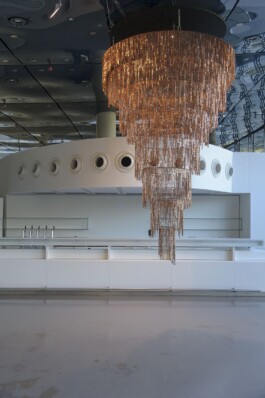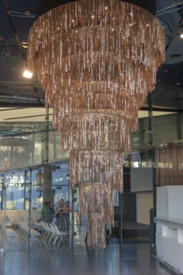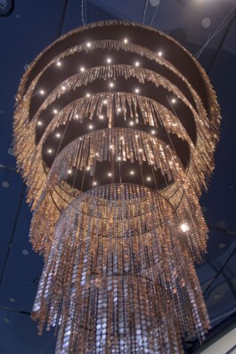 EPHEMERE („ephemer“ = flüchtig, vergänglich) ist zusammengesetzt aus Tausenden Ein-Cent-Münzen. Zunächst erinnert sein Glanz und seine Größe an schillernde Kronleuchter aus der Jahrhundertwende und der Zeit des Art déco. Auf den zweiten Blick spielen die Kupfermünzen jedoch auf die Flühtigkeit von Werten an, auf die Vergänglichkeit des Geldes an sich, und auch auf den unmittelbaren Plan der europäischen Banken, die „wertlosen“ Ein- und Zwei-Cent-Münzen abzuschaffen.